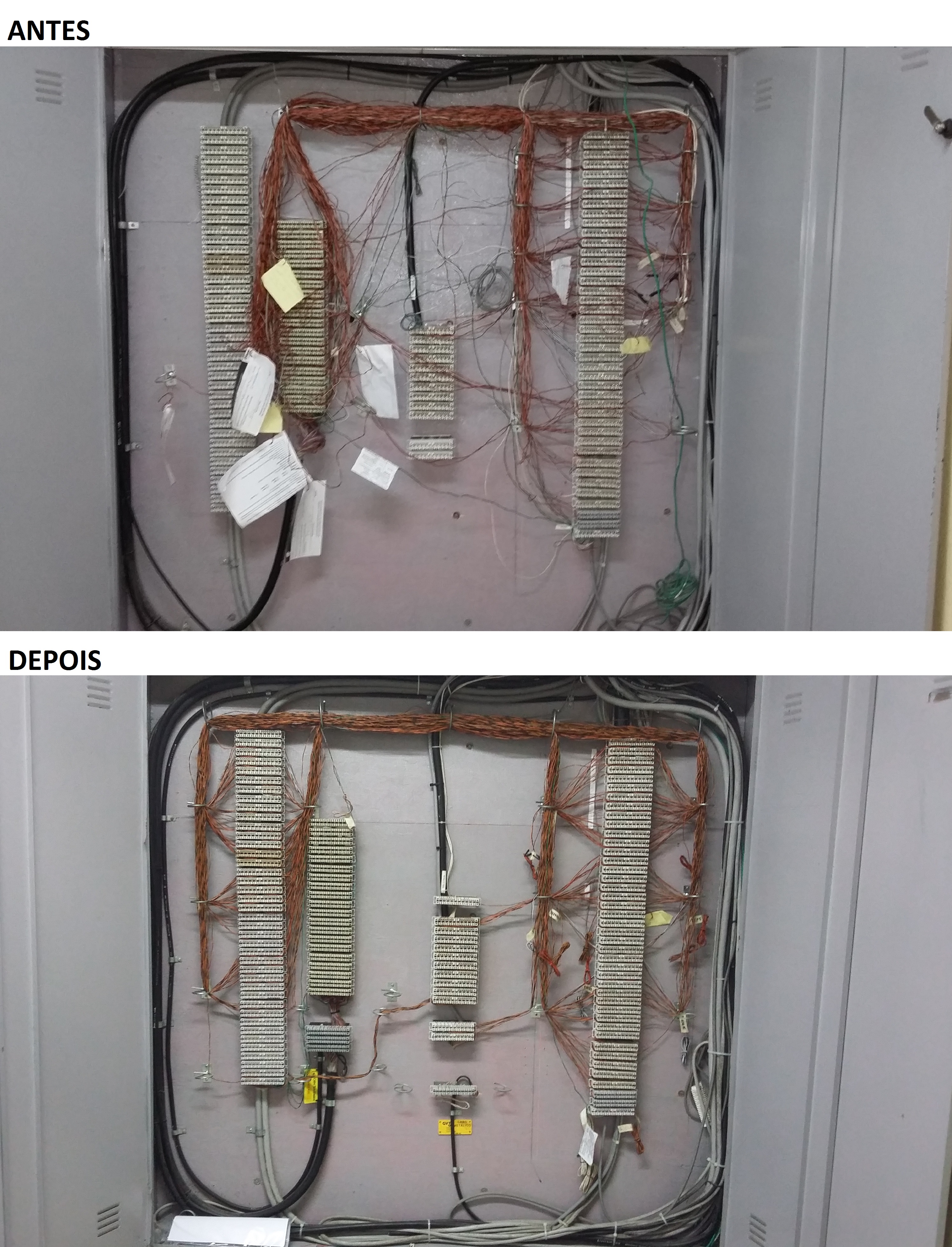 Junto com a implantação da nova central, também foi efetuada a organização do distribuidor geral de telefonia, abaixo a foto de antes e depois do serviço: