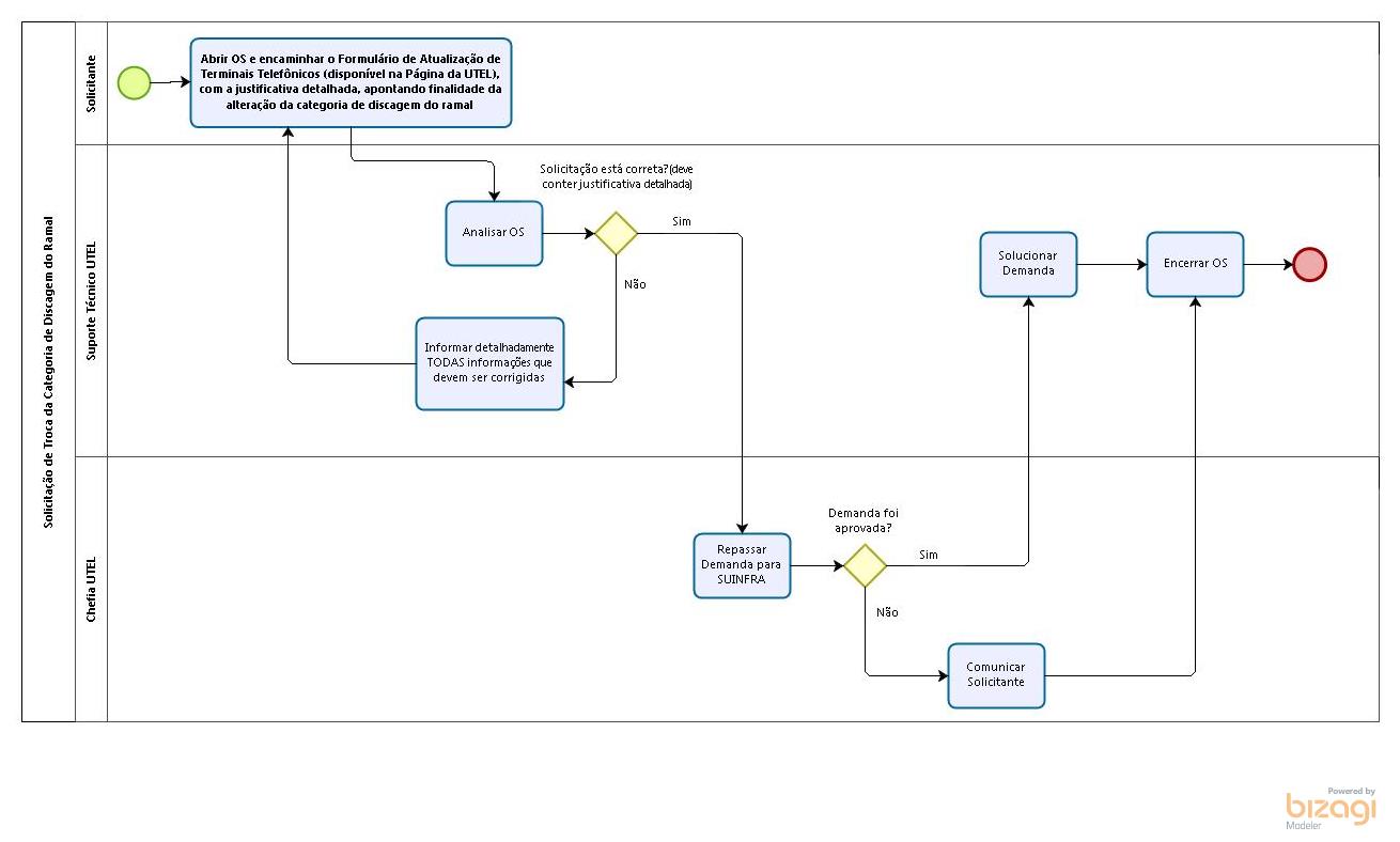 Solicitação para troca de categoria de discagem: a exemplo das solicitações de novos ramais, este tipo de solicitação deverá conter a justificativa pelo qual está sendo efetuada a solicitação, fundamentando sua necessidade, onde a mesma estará sujeita a aprovação (uma vez que poderá implicar em um gastos adicionais). O solicitante deverá abrir uma OS pedindo a alteração no ramal telefônico e preencher simultaneamente o Formulário Solicitação / Alteração de ramais.