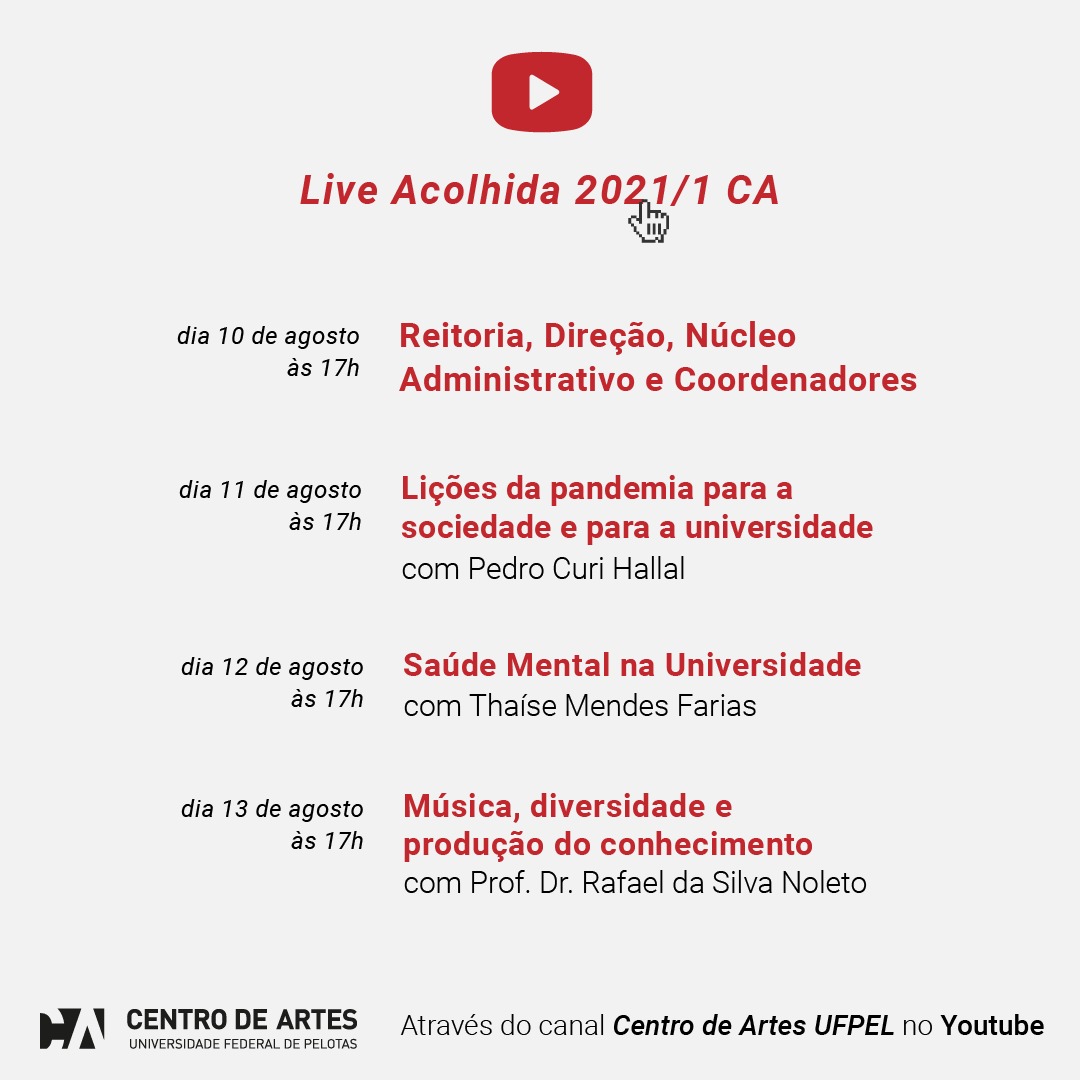 Com intuito de receber os novos alunos que ingressam no CA neste semestre que se inicia e também aos nossos demais alunos que recomeçam um novo semestre letivo, encaminho abaixo a programação das Lives que ocorrerão semana que vem no canal do Youtube do CA.