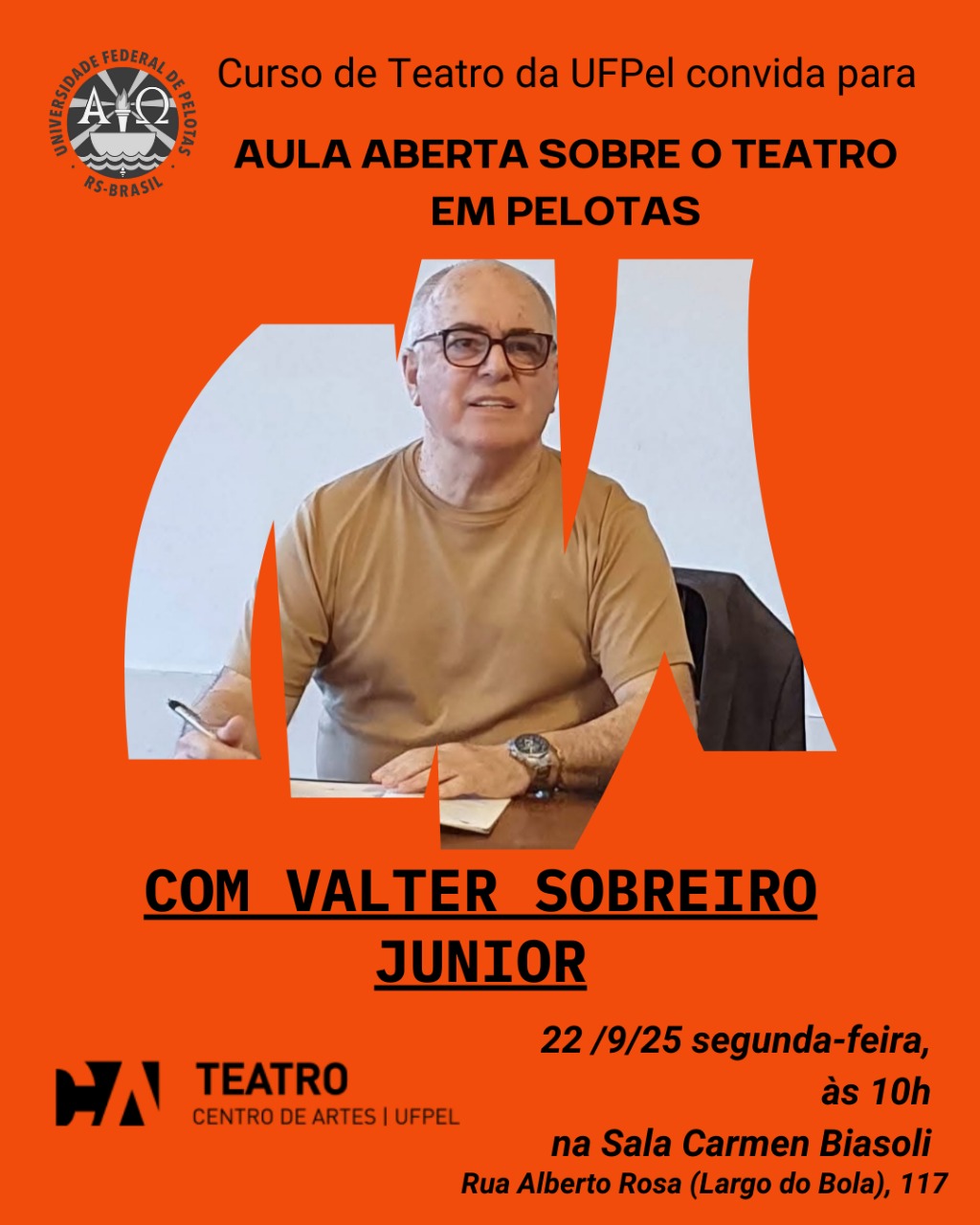 Todes estão convidados para a Aula aberta do curso de Teatro da UFPel, sobre o Teatro em Pelotas, com Valter Sobreiro Junior, dramaturgo, escritor, diretor, cenógrafo, com mais de 60 peças montadas e algumas dezenas de prêmios. Não percam! Atividade aberta e gratuita para todas as pessoas interessadas! Quando: 22 de setembro, segunda-feira, às 10h. Onde: Sala Carmen Biasoli – Rua Alberto Rosa (Largo do Bola), 117.