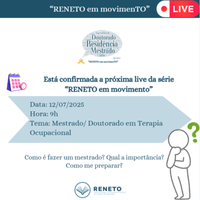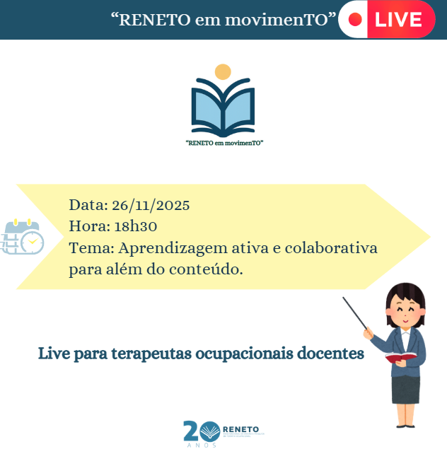 A Rede Nacional de Ensino e Pesquisa em Terapia Ocupacional (RENETO) está organizando mais uma série de lives dessa vez voltada para terapeutas ocupacionais que atuam na docência, e vai abordar sobre temas pertinentes ao aprimoramento desta prática profissional.
