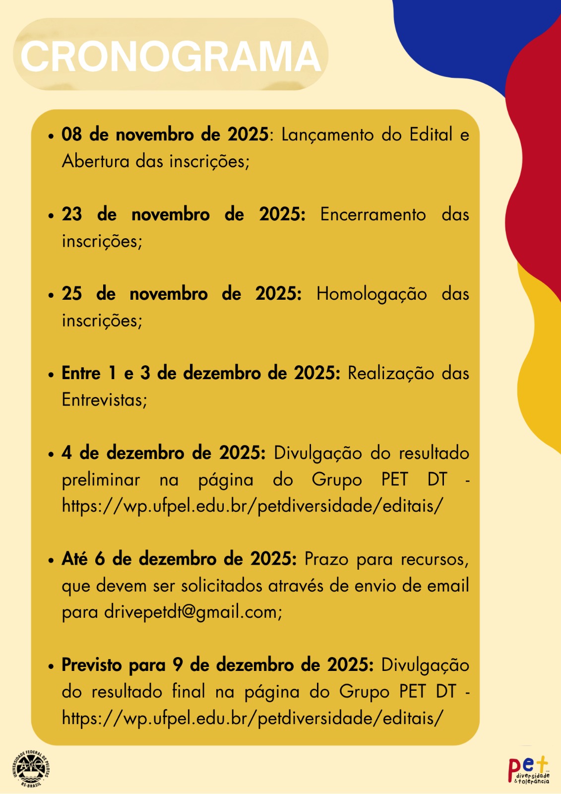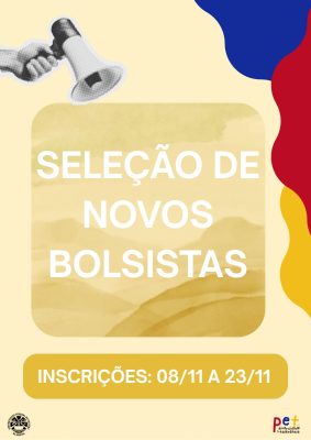 O PET Diversidade e Tolerância torna público o edital 02/2025 que diz respeito à seleção de novos petianes/as/os, tendo disponibilidade de um total de 01 (uma) vaga para bolsista e 08 (oito) vagas para suplentes. Confere edital e vem fazer parte do nosso time!