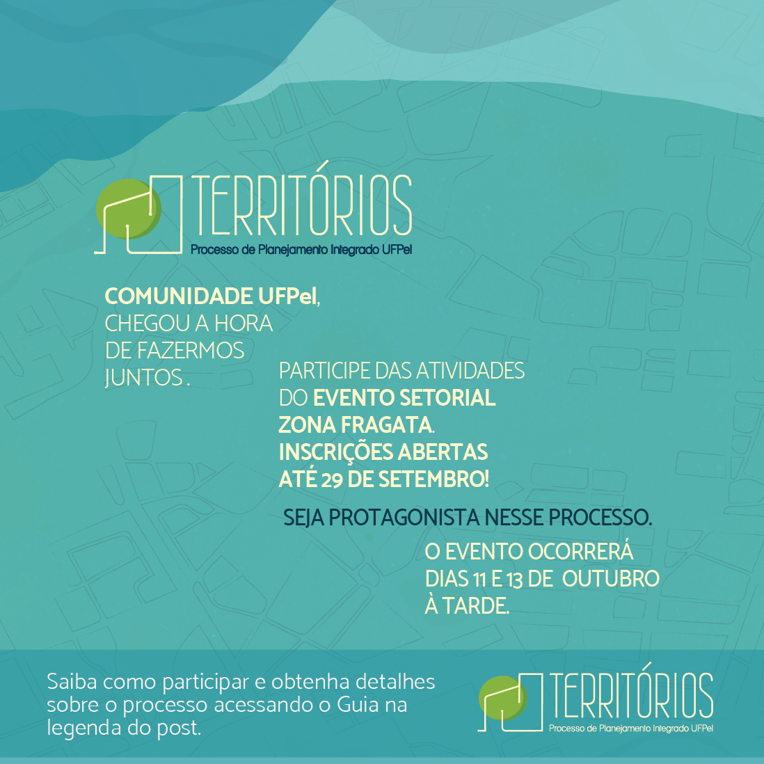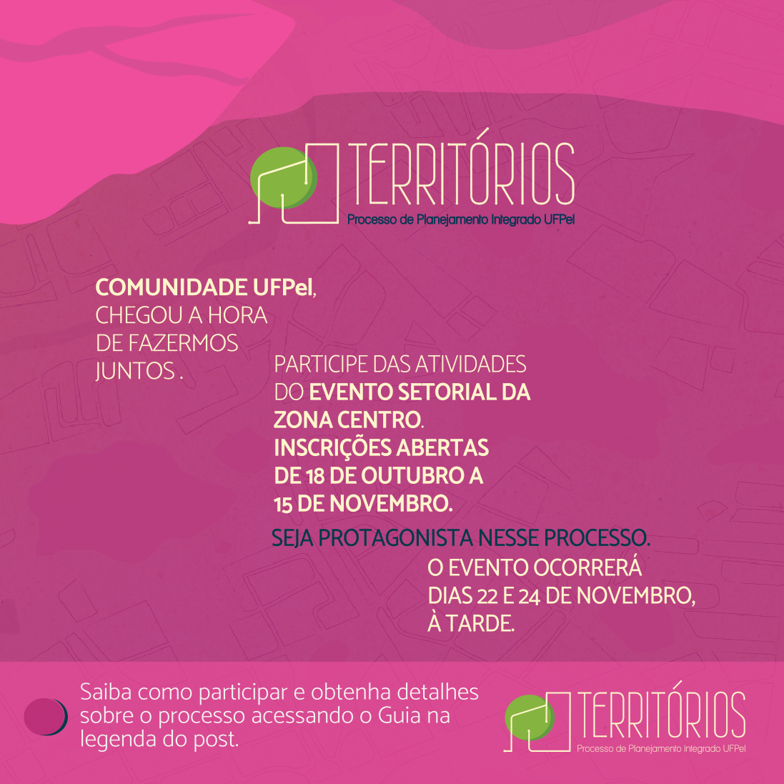 Estão abertas as inscrições para o Evento Setorial da Zona Centro, que acontecerá nos dias 22 e 24 de novembro, das 14h até as 17h30. O evento é aberto a toda a comunidade interna, especialmente às unidades que compõem essa zona de planejamento (neste caso, CIM, Conservatório de Música, FD, FO, Museus, Cine UFPel, LAMINA, LINSE, Rádio Federal FM, INOVA). Para se inscrever basta preencher o formulário que estará aberto até o dia 15 de novembro. Os Eventos Setoriais são a oportunidade de a comunidade […]