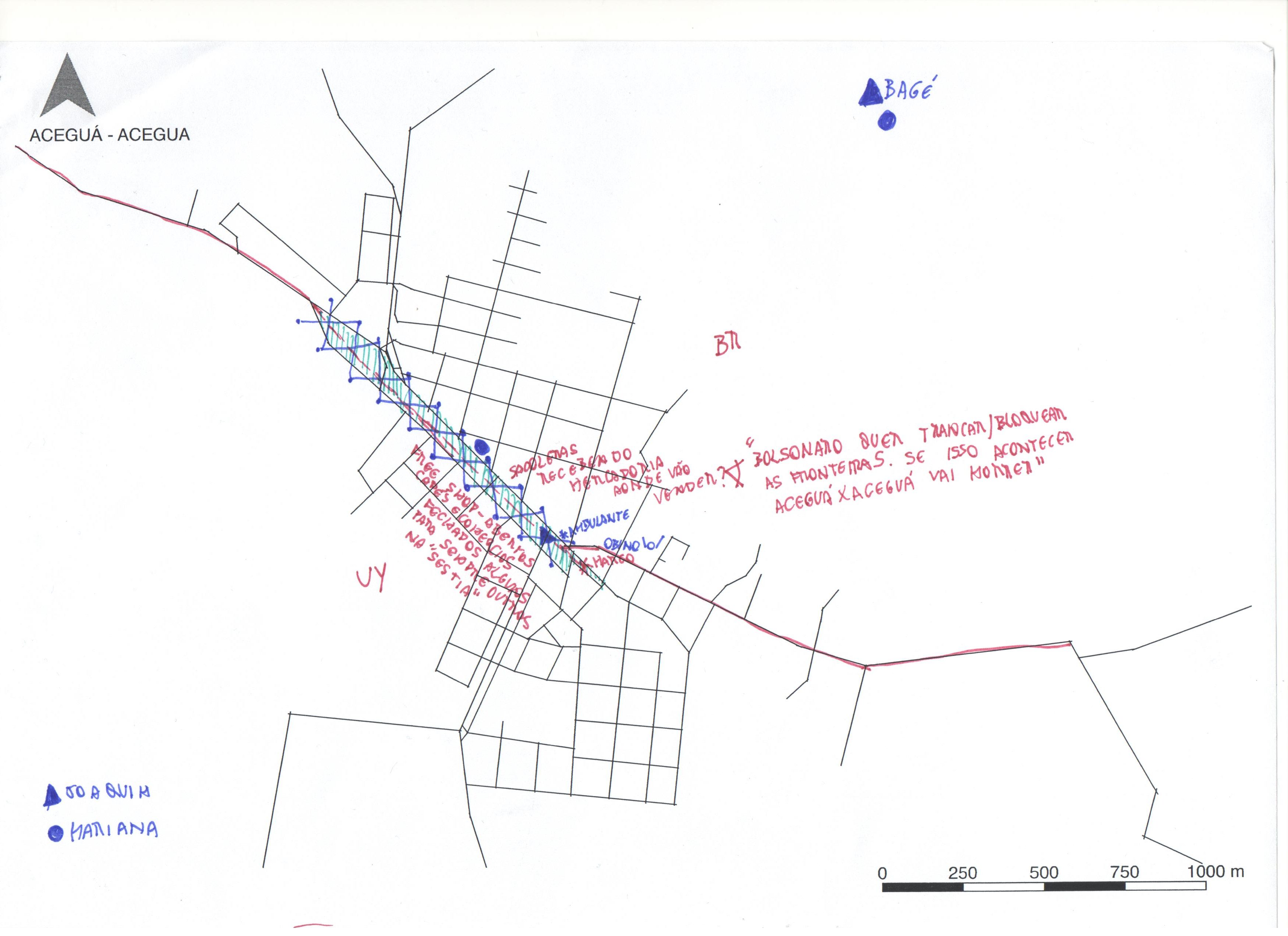 Para apoio do mapeamento foram distribuídos aos viajantes os mapas dos eixos viários das 12 cidades estudadas e no momento da travessia da linha de fronteira era possível escrever, anotar, desenhar e fotografar pontos de interesse conforme a percepção individual de cada um dos participantes. A pesquisa possui um enfoque qualitativo, não importando assim a quantidade de mapas gerados ou informações absorvidas, mas as experiências subjetivas. A análise dos mapas será realizada com a sobreposição das informações por cidades, cidades-gêmeas, países, temas, etc.