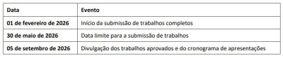 Estrutura do Trabalho: Os artigos completos devem ter entre 10 e 15 páginas, seguindo a estrutura padrão: Título, Autores/Afiliação, Resumo, Palavras-chave, Introdução, Fundamentação Teórica, Metodologia, Resultados e Discussão, Considerações Finais e Referências. As normas detalhadas de formatação serão disponibilizadas no site do evento (em breve será disponibilizado o layout para a submissão dos trabalhos ao evento).
